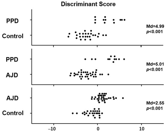 Discriminant scores (D-scores) calculated by the linear discriminant equations for PPD vs. control, PPD vs. AJD, and AJD vs. control. Each filled circle indicates the individual data. Mahalanobis distance (Md) and p value are shown on the right side.