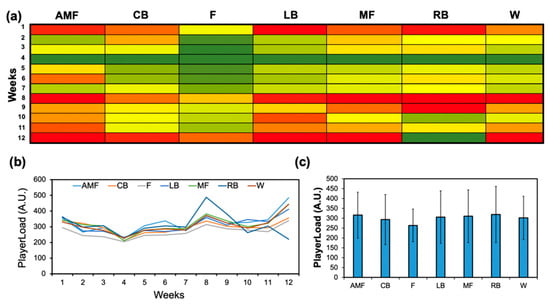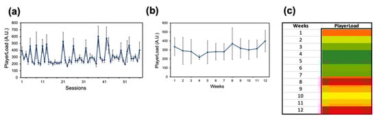 PlayerLoad for the CWRU soccer team. (a) Mean workload in each training session and match session. (b) Mean workload over each week, including training and matches. (c) Heat map generated to correlate workloads into a qualitative color-gradient platform for efficient viewing.