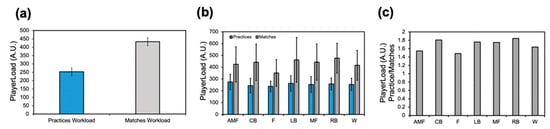PlayerLoad profiles for each position group on the CWRU soccer team. (a) Comparative bar plot assessing workload differences between practice and matches for the entire team. (b) Comparative bar plot assessing workload differences between practice and matches for each position group on the entire team. (c) The ratio between the match and practice workloads as a function of the various position groups on the team.