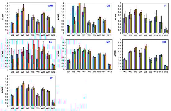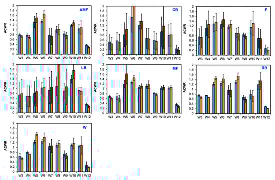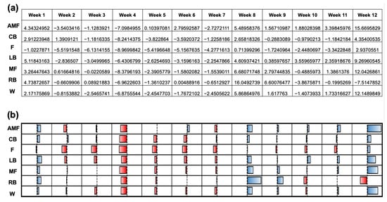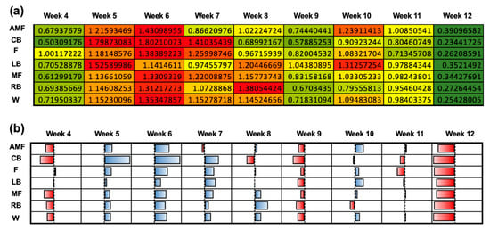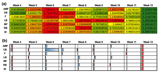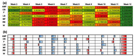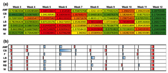 The uncoupled ACWR was calculated when the chronic workload was calculated over a 4-week period. The correlation of the ACWR for each position is visualized on a color-gradient platform (Figure 9a). For all position groups, low workloads were seen in weeks 4, 9, and 12. The ACWR during these weeks ranged from 0.19 to 1.03 (excluding the LB position in week 9). Week 6 showed similar and high uncoupled ACWRs for all positions. The normalization of the workload data is qualitatively visualized (Figure 9b). Week 12 illustrated the most negative deviations from the mean ACWR, as visualized by the red color in the normalization plot. Week 6 portrayed positive deviations from the mean ACWR, as illustrated by the blue color for all positions (Figure 9b). The differences between the uncoupled and coupled ACWRs across the 4-week period for each position and week were compared (Figure 10). For the AMF, CB, F, MF, and W positions, both the coupled and uncoupled ACWR were highest at week 6. The uncoupled ACWR exceeded the coupled ACWR here—for example, in the AMF position, the uncoupled workload at week 6 was 1.68 and the coupled ACWR was 1.43.