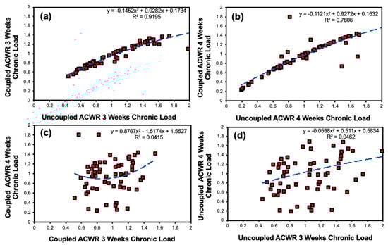 Relationships between coupled and uncoupled workloads with 3- or 4-week chronic workloads. (a) Coupled versus uncoupled when the chronic workload was measured over a 3-week period. (b) Coupled versus uncoupled when the chronic workload was measured over a 4-week period. (c) Coupled ACWR with a 4-week chronic workload versus chronic ACWR with a 3-week chronic workload. (d) Uncoupled ACWR with a 4-week chronic workload versus uncoupled ACWR with a 3-week chronic workload. The red squares represent the data and blue dashes displays the logarithmic best fit curve.