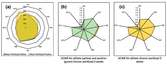 The visualization here illustrates that the ACWRs for the specific athlete and for the entire team were similar, as overlaps are displayed in the spider charts. The comparative profile of the ACWR when the chronic workload was 3 weeks was additionally visualized (Figure 12c).