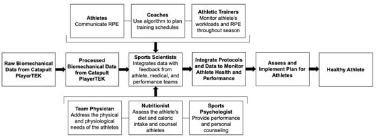 The implications of this study further suggest the potential to create an athlete management system for coaches, athletic trainers, team physicians, and athletes to follow in future seasons (Figure 13). This collaborative effort with the implementation of objective workload data, however, requires the development of clinically meaningful algorithms that can translate data from commercial devices, such as the Catapult. The qualitative gradient of red, yellow, and green to depict workloads and normalizations of the workloads, as presented in this study, serves as a means of easily visualizing the musculoskeletal modeling of an individual’s workload. While sports were the platform for this study, the measurement of acceleration and workload can further be translated to patients with neuromuscular diseases where changes in gait behavior are known to affect quality of life.