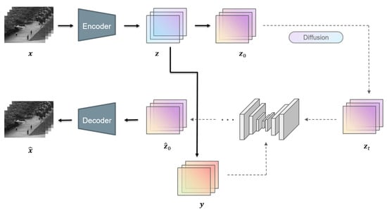 In contrast with traditional autoencoders such as VAE, we remove the Kullback–Leibler divergence in the training loss. The Kullback–Leibler divergence aims to summarize the distribution in lower dimensions and avoid high variance []. However, its effectiveness is limited in the complex distribution of various scenarios. Furthermore, since the features of different scenarios vary significantly, the Kullback–Leibler divergence will inevitably disrupt the internal features of all the instances while optimizing the training loss, thereby compromising the generation ability. Instead, we opt to scale the encoded frames using min–max normalization for a better convergence of the model, which is based on the maximum and minimum pixel value of frames. During this, frames are projected into lower dimensions, keeping the inherent features of the original structures. Meanwhile, the feature differences between different scenes will not be broken and can be fully learned about by the model. After compression through the encoder part and normalization, we obtain the final latent input: