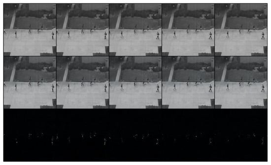 Compared with men walking, the proposed method detects noticeably different patterns and objects such as a car driving, which distorts information in the spatio-temporal feature and generates low-quality frames. As shown in the bottom row in Figure 4, the pixel errors of the vehicle are much higher than those of other objects.