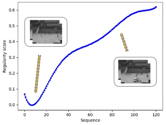 Regularity score curve during a sequence. In normal frames, the score is low, while it becomes high as the car and a man riding a bicycle occur.