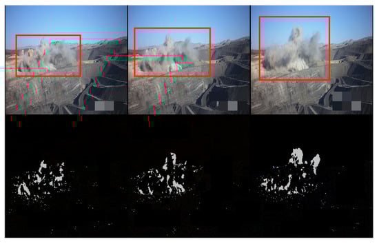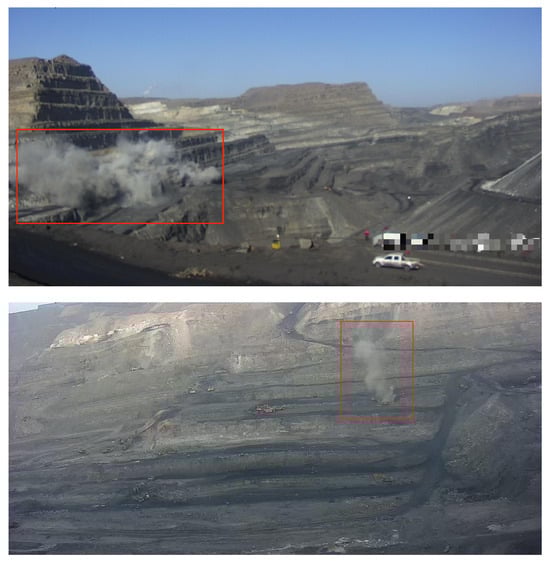 In this practical situation, we applied the proposed method to monitoring. We used a new dataset containing videos from various angles and construction events collected by CCTV cameras covering more than 15 mining areas in a coal-producing city in China that implements daily day and night recording. Abnormal harmful Dust in these mining areas in the dataset are shown in Figure 6. Three frame intervals in the given sequences are available from the dataset: a completely continuous video without frame loss, 5 min between two frames and 10 min between two frames.