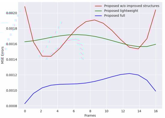 Reconstruction error curves of models in the ablation study which were curved in a 16-frame clip in normal video surveillance. The proposed full model obtains the lowest errors in all three compared models.