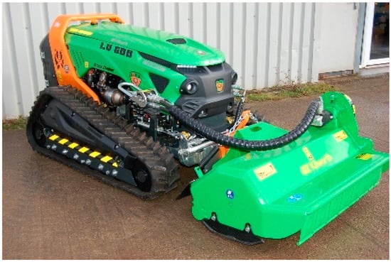 The robotic platform used for this study is a Green Climber LV 600 PRO forest machine by MDB (manufactured by MDB, Fossacesia, Italy), as depicted in Figure 1. It is a remotely controlled tractor designed for vegetation cutting in dense forest environments.