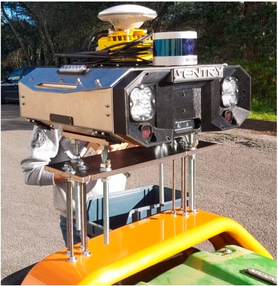 For its control and sensory perception, an architecture named Sentry was defined, consisting of a “plug and play” sensor box adapted to the specifications of this and other forest machines. This system incorporates a set of sensors that enable different levels of autonomy, defining various subsystems, each with its own architecture, to provide autonomous navigation for the robot. The Sentry system is mounted on the rear of the tractor, connected to the forest machine, making it possible to control the vegetation-cutting equipment.
