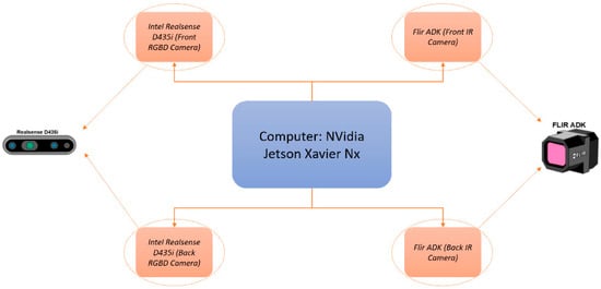 The FLIR ADK thermal cameras, developed by the FLIR System, use infrared sensors to capture thermal images of the surrounding environment. Specifically designed for object detection and temperature information, the FLIR ADK excels in providing data in conditions of low visibility, such as darkness, fog, smoke, or other common adverse scenarios [20]. In addition to the mentioned capabilities, the FLIR ADK can be combined with other sensors, such as RGB cameras and LIDAR sensors, to create a comprehensive vision system of the environment around the machine. This sensor fusion provides a more accurate perception of the scenario, enabling object identification and enhancing safety during vehicle navigation [20]. The need to integrate FLIR ADK cameras arises in adverse situations, such as the presence of dust, common in forestry operations. In such environments, the introduction of dust can impair the performance of certain sensors, such as RGBD cameras, making infrared cameras a valuable resource for these situations [21]. In the Sentry, the RGBD cameras will be located at the front and back of the box, while the thermal cameras will be located at the front of the box. The primary goal of this vision system is to provide increased safety throughout the operation of the LV600 Pro; thus, sensor redundancy is desired, to cover all possible scenarios (dust, debris, smoke, multiple lighting conditions, etc.).
