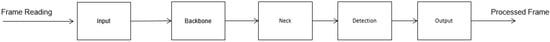The architecture of YOLOv5 comprises five sections, as depicted in Figure 4. The input block divides the image into sections, with each section responsible for detecting a specific region of the image. The backbone extracts image features, while the neck, an intermediate part of this architecture, performs fusion to enhance object detection. The detection section assigns a specific class to the detected objects, and finally, the output generates detection results such as class, confidence, location, and size [23].