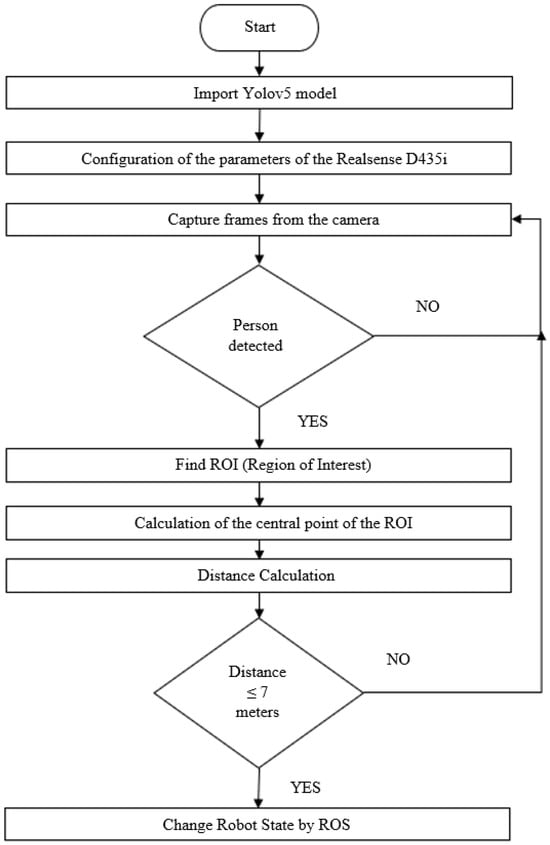 The work carried out on this topic focused on the analysis of data from RGBD cameras. An algorithm was implemented for object identification and distance measurement. Emphasis was given to the detection of people, and the algorithm was used to measure distances to obstacles in the environment to change the robot’s state. For this specific case, it was decided that when the robot is executing a particular trajectory and detects a person within a certain distance, the robot should immobilize itself. This method was proposed because we are dealing with a forest grinding machine, and when it performs the vegetation grinding function, it sometimes projects forest residues. Therefore, immobilizing the machine along with all its functions becomes an important aspect for the safety of both the machine and the surrounding environment during its navigation. The block diagram presented in Figure 5 illustrates the functioning of the vision system incorporated into the Sentry system.
