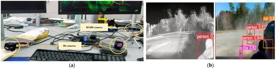 Test to verify the operation of YOLOv5. (a) Setup with two thermal cameras, one RGB camera, and one depth camera; (b) YOLOv5 response.