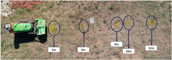 In order to verify the performance of the proposed algorithm in Figure 6, an experimental test was conducted, specifically, the verification of distance measurement when a person is detected (this information comes from YOLOv5, as demonstrated in the test conducted in Section 4.1). To conduct this test, markers were placed on the ground at strategic distances, as illustrated in Figure 8. A person occupied each of these positions at the markers, providing real distance data, which were then compared with the camera readings. The markers were placed at intervals of 3, 6, 9, 10, and 12 m. The variance between the camera data and the actual values obtained from these markings was calculated.