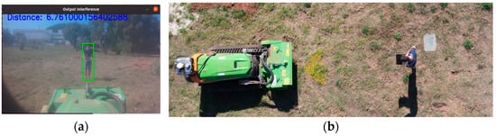 To validate the setup in the field, a person moved to each of the strategic marks, staying at each one for approximately 3 s, and thus, approximately 20 points were collected for each position. Figure 9 shows a person’s position at one of the marks, and the vision system performed detection with distance measurement.