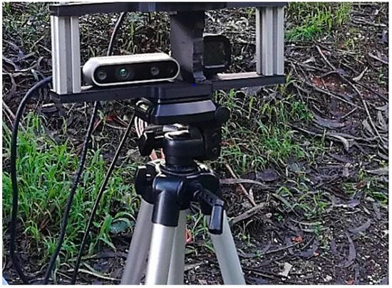 Data were collected in a forest environment using an RGBD Realsense D435i camera (manufactured by Intel Corporation, Aloha, OR, USA; Hillsboro, OR, USA) and a thermal camera Flir ADK (manufactured by Teledyne FLIR, Wilsonville, OR, USA, EUA) mounted on a support, as shown in Figure 10.