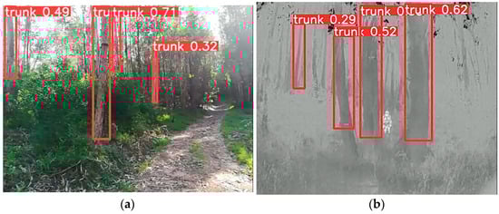 We can observe that the Trees_dataset has a high mAP:50 score, indicating that the model is highly accurate in detecting tree trunks. This means that, on average, it can recognize the location of tree trunks with great precision, even in scenarios with overlap with other elements in the environment. The mAP50:95 metric demonstrates a good ability to detect tree trunks in different scenarios. The precision metric of 0.901 indicates that the model has a very high rate of correct detection of tree trunks, which is crucial in scenarios where the precise identification of tree trunks is a fundamental aspect. Finally, the recall metric of 0.893 indicates the efficiency of the model in identifying most tree trunks in each environment. Figure 11 shows an example of correct tree trunk detection, where Figure 11a shows an example taken by the RGBD camera and Figure 11b shows an example taken by the thermal camera.
