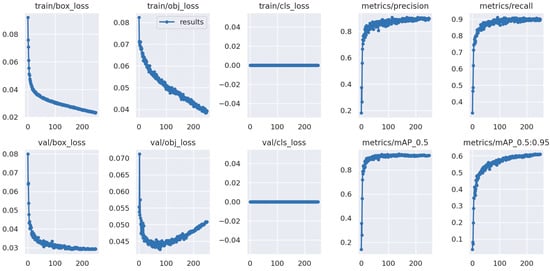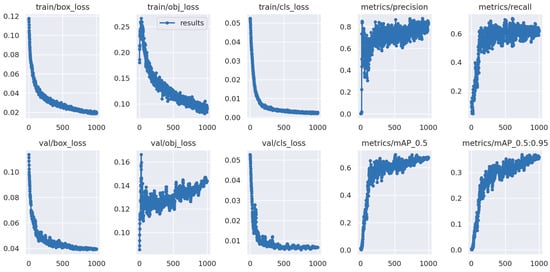 The YOLOv5s model was trained using a local computer equipped with a six-core AMD Ryzen 3600 processor (manufactured by AMD, Santa Clara, CA, USA), 16 GB of DDR4 RAM, and an NVIDIA GTX 1660 SUPER GPU (manufactured by Nvidia, Santa Clara, CA, USA) with 6 GB of video memory. After the training was completed, the evaluation metric values for each dataset were obtained, and these can be viewed in Table 4.