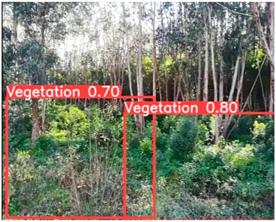 Finally, regarding the Vegetation_detection dataset, the value given by the mAP:50 metric indicates the good accuracy of the model in detecting vegetation. This means that, on average, the model can accurately locate areas with vegetation even when there is overlap with other elements. The value obtained by the mAP50:95 metric indicates that the model may have a somewhat more challenging performance when the overlap with other features (i.e., other elements in the scene) is greater or less than 50%. Regarding the precision metric of 0.796, it indicates that the model has a high rate of correct detection of vegetation, which is extremely important because the model will be able to identify most areas with vegetation. The obtained recall metric indicates that the model can correctly capture most regions with vegetation, suggesting that the model is not missing areas with vegetation. Figure 13 shows an example of the correct detection of areas with vegetation, where the images are provided by the RGBD camera.