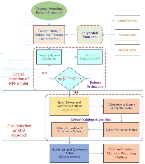 In order to get high precision estimation of seabed topography quality, a dual robust strategy (DRS) is developed in this study to address the issue of fine detection of sounding outliers. DRS technique includes the dual detection process of robust polyhedral function (RPF) and robust kriging algorithm (RKA). The polyhedral function in RPF model was employed to construct the bathymetric terrain trend surface. Combining the robust estimation model with iterative weight selection, the weight of outliers was continuously reduced to smoothly resist the interference of outliers on the overall terrain undulation. Furthermore, RKA approach was implemented to further solve the issue of local protruding anomaly characteristic by removing minor errors anomalous spots. Ultimately, the entire DRS technique is able to handle different types and sizes of sounding outliers to improve the quality assessment of underwater topography. The frame design for detecting and removing outliers in depth measurement is shown in Figure 1.