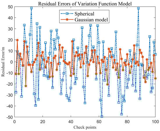 Figure 6 displays the residual error of test points after applying different variation function fitting models. The residual error of gaussian model fluctuates within the permissible range. The spherical model’s residual inaccuracy is greater than 20 m in comparison to the sounding value of roughly 1300 m, and the variation is somewhat greater. It is advised against adopting the spherical model since the results show that it has a poor fitting effect on the variation function in the sounding data in this research. For this reason, the gaussian model was utilized in the ensuing tests to match the variation function.