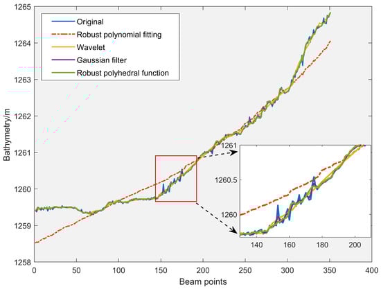 Peak anomalies of various sizes are clearly present in the original sounding data, as seen in Figure 7. We compared the quality of outlier detection among multiple schemes. Figure 7 reveals that robust polynomial fitting can only consider the trend of depth variation. Furthermore, robust polynomial fitting model prevents abnormal spots with characteristic changes from exhibiting excessive variance, particularly at the depth measurement locations on both ends. This model is overly rigorous and strict, which makes it easy to make mistakes in judgment and alter the significance of typical sounding locations. WT, GF, and RPF approach are the other three schemes that can all roughly match the waveform’s trend. By zooming in on the local area in Figure 7, it can be observed that our RPF model can effectively widen the gap with the peak outliers, which is more conducive to using weight functions or the criterion of triple mean square error for outlier detection.