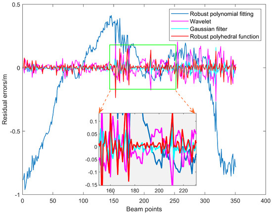 The residual error is obtained by the difference between the sounding estimates and the observed values, as shown in Figure 8. The mean square error can characterize the removing performance of the model. While the mean square error of robust polynomial fitting is 0.176, the robust polynomial fitting mean square error is 0.0232. In addition, WT and GF are in the middle range. Additionally, the residual error fluctuation of WT is relatively large, which indirectly rises the value of mean square error and inevitably increases the uncertainty of determining the anomaly point. The residual fluctuation of GF is small at all positions, making it challenging to determine outliers using the criterion of triple mean square error. Besides, Figure 8 shows that robust polynomial fitting performs poorly in fitting depth measurements at both ends, resulting in excessive residuals in these areas and significantly leading to misjudgment of outliers. Meanwhile, the fitting values of our RPF model approximate the trend of sounding. The residual peak is directly noticeable in sounding anomalies, which helps track the anomaly’s source. Significant errors can be avoided when detecting anomalous soundings places with the RPF model.