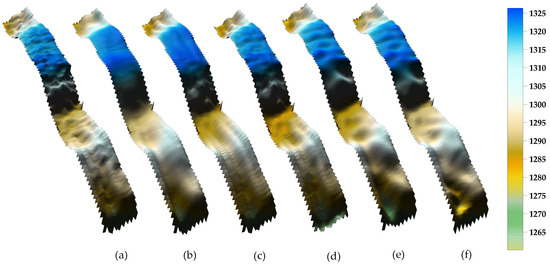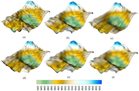 DEM maps of Area 1 after eliminating outliers. (a) original DEM. (b) RPF. (c) WT. (d) GF. (e) WLS-SVM. (f) DRS technology.