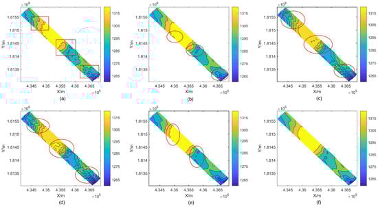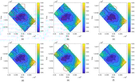 Contour maps of Area 1 after removing outliers. (a) original data. (b) RPF. (c) WT. (d) GF. (e) WLS-SVM. (f) DRS technology. The red boxes and circles in the figure are used to highlight the experimental effect in this area.