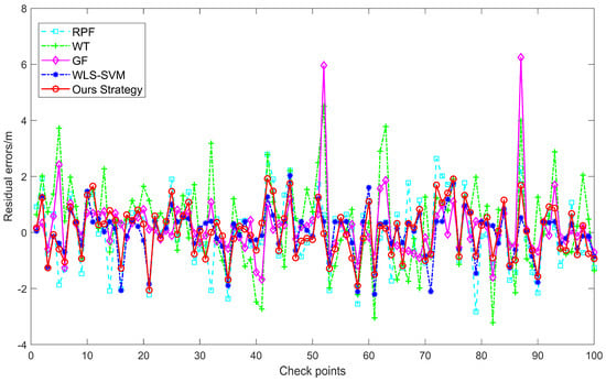 In order to verify the response of the proposed DRS technology to different terrains and anomaly distributions, we used the RPF, WT, GF, and WLS-SVM schemes to assess the terrain quality. The Area 2 sounding dataset with higher terrain complexity and wider error distribution was analyzed. Furthermore, a sample of 100 typical sounding points was chosen for a discussion on the suggested technology’s capacity to solve problems. The performance of errors and residuals, as displayed in Table 3 and Figure 11, shows the excellent performance of the proposed DRS technique.