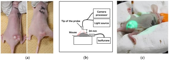(a) Cet-IR700-dosed tumor-bearing mice, (b) Fluorescence imaging acquisition setup using mouse, and (c) laser diffuser irradiation method.