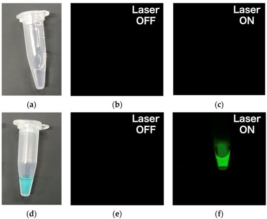 (a) A 1 mL tube containing water as a negative control, (b) image of the tube containing water taken by the fluorescence sensor before laser irradiation, (c) image of the tube containing water taken by the fluorescence sensor during laser irradiation, (d) 1 mL tube containing IR700 solution as a positive control, (e) image of the tube containing IR700 solution imaged by the fluorescence sensor before laser irradiation, and (f) image of the tube containing IR700 solution imaged by the fluorescence sensor during laser irradiation.