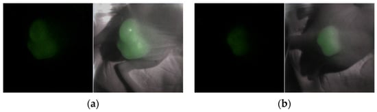 This device was used to image phantoms containing water and the IR700 solution, as shown in Figure 4a,d. As shown in Figure 4b,c, no fluorescence was detected in the water sample, whereas fluorescence was observed in the IR700 tube when exposed to the laser, as shown in Figure 4e,f. This confirmed that the laser wavelength was blocked by the filter, and only the fluorescence wavelength was captured.