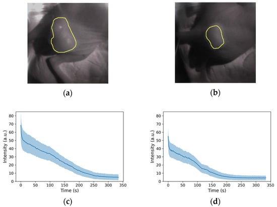 (a,b) Boundaries(yellow line) of pixels taken to average intensity. (c,d) Relationship between laser irradiation time and decay of fluorescence intensity for each mouse.