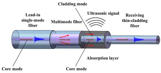 The SMTC structure, shown in Figure 1, comprises three components: a lead-in single-mode fiber (SMF), a multimode fiber (MMF), and a receiving thin-cladding fiber (TCF). The pulsed laser is transmitted through the lead-in SMF, and as it enters the MMF, the laser light is dispersed. The dispersed light propagates through the MMF, and as it reaches the interface of the TCF, a portion of light energy couples with the TCF core to form the fundamental mode, which is then transmitted through the receiving TCF. Another portion of light energy couples with the cladding to form high-order cladding modes, which then reach the light-absorbing layer of the photoacoustic material. Additionally, due to the disparity of the cladding thickness between the MMF and TCF, some of the light in the MMF cladding directly reaches the photoacoustic material and is then absorbed by the material. The periodicity of the pulsed laser causes the material to vibrate periodically, generating ultrasonic signals due to the thermoelastic effect. Consequently, compared to fibers with different diameters, TCF can yield a more substantial light absorption effect on photoacoustic material when absorbing the same light energy, resulting in an increased amplitude of the generated ultrasound. In previous studies [28,29,30,31,32,33], the etching process involved in the preparation greatly increases the risk of experimental operation and cannot guarantee the efficiency of the experiment. The TCF is used as a replacement for a cladding-etched fiber to enhance the absorption of light energy by the photoacoustic material, and generate stronger ultrasonic signals.
