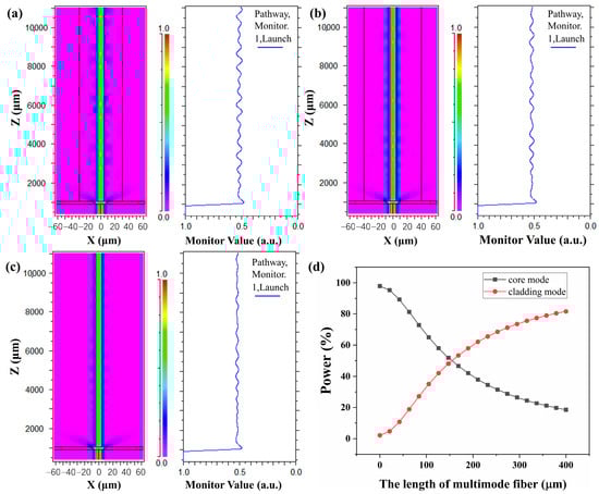 The transmitted light-field distribution results are shown in Figure 2a. The field distribution remained stable as the light propagated in the fundamental mode through the lead-in single-mode fiber (SMF) over a distance ranging from 0 to 1000 µm. As the light propagated toward the interface between the SMF and MMF, it dispersed and excited high-order modes due to the mismatch between the two fiber cores. The high-order modes then propagated within the MMF until they reached the interface between the MMF and TCF. At this point, due to the larger mode field diameter in the MMF compared to the TCF, some of the light energy was directly absorbed by the photoacoustic material for ultrasonic signal excitation, whereas the remaining light energy coupled into the TCF fiber core and cladding, generating high-order modes. The variation in light energy along the SMTC structure is shown on the left. The core-mode energy diffuses over the MMF region, resulting in a sharp decrease in the light energy, with approximately 50% of the remaining energy entering the receiving TCF. The light energy that coupled to the fiber core transformed into the fundamental mode of the TCF (typically LP01), whereas the light energy that coupled to the cladding forms the high-order mode (LP0m). However, the disparities in core diameter and mode field diameter between the MMF and TCF lead to a mode field mismatch, resulting in the local focusing of light and coupling of the multiple modes of the MMF into the core mode of the TCF. This interference between modes creates a small disturbance in the core-mode region, causing energy fluctuations in the core mode. We also conducted simulations for receiving fibers with diameters of 80 µm and 125 µm, as shown in Figure 2b,c. The results demonstrate that the diameter of the receiving fiber has minimal impact on the coupling efficiency of the structure. This finding is consistent with previous research that partially etching the fiber cladding does not affect the coupling ratio of the structure [28,29,30,31,32,33]. It is noteworthy that as the diameter of the receiving fiber increases, the mode field mismatch becomes smaller, resulting in a decrease in the energy fluctuations within the core region of the receiving fiber. However, the diameter difference between TCF and MMF makes the light absorption effect of photoacoustic materials greater, the smaller the diameter of the TCF, the more advantageous it is, but at the same time, the structure must still maintain mechanical strength and can be fused by the splicer easily. For these reasons, we adopted the 60 μm TCF. Figure 2d shows the simulated relationship between the MMF length and power levels in the receiving TCF. As the MMF length increases incrementally at a 20 μm interval from 0 to 400 µm, the power level in the fiber core mode decreases, whereas the power level of the cladding mode increases. This result highlights the direct correlation between the coupling efficiency of each SMTC structure and the length of the MMF. Consequently, adjusting the MMF length enables the development of SMTC structures with different levels of coupling efficiency, providing flexibility in tailoring the SMTC design to achieve desired performance characteristics.