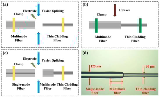 The fusion point of the MMF and TCF can be easily observed under a microscope due to disparities in their cladding sizes, avoiding the use of hollow core fiber as a fusion splicing medium, and simplifying their preparation process, particularly when the MMF is cleaved to the desired length. Figure 3a–c show the fabrication of the SMTC structure. First, the TCF and MMF were cleaved. Then, the two fibers were spliced using a fusion splicer (Fujikura FSM-80S (Tokyo, Japan)), as shown in Figure 3a. Next, the fused structure was placed on a displacement platform, and the platform was adjusted to obtain a desired MMF length facilitated by a microscope and cleaved, as depicted in Figure 3b. Finally, the fiber acquired from the previous step with the SMF was spliced, as shown in Figure 3c, successfully yielding the SMTC structure (Figure 3d). By performing these simple micro-scale cleaving and splicing steps, SMTC structures with the required length of the MMF can be fabricated according to the number of transducer units, thereby optimizing the system.