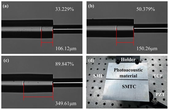 To ensure the uniform and stable generation of ultrasound signals from each SMTC-based transducer unit, precise energy balancing of the laser coupled to the fiber cladding is required. For instance, in a three-point ultrasonic transducer system, the energy consumption should be distributed equally among each transducer unit, with each unit receiving approximately 33% of the total energy. To achieve this, three SMTC structures were prepared with a coupling efficiency of 33.229%, 50.379%, and 89.847%, each with different MMF lengths of 106.12, 150.26, and 349.61 µm, respectively. Figure 4a–c show the microphotographs of the fabricated SMTC structures. The difference between the coupling efficiency noted in Figure 4c and the simulated values presented in Figure 2d is mainly attributed to the fusion splicing losses during the fabrication process. Therefore, the coupling efficiency values reported in this paper are based on precise measurements obtained in measurement. The distribution of extracted energy from the fiber core among the three structures is as follows: 33.229% in the first structure, 33.639% in the second, and 29.768% in the third. In the SMTC-based transducer system, the prepared fiber-optic SMTC structures are placed on a pre-fabricated aluminum plate measuring 100 × 100 × 1 mm3. The plate has a pre-etched groove at the center with a depth of 200 μm. Subsequently, the photoacoustic material is coated and heated for solidification. The configuration of the SMTC-based transducer unit is shown in Figure 4d. By connecting these SMTC-based transducer units in ascending order of coupling efficiency, a multipoint energy-balanced laser-ultrasonic transducer system can be achieved.