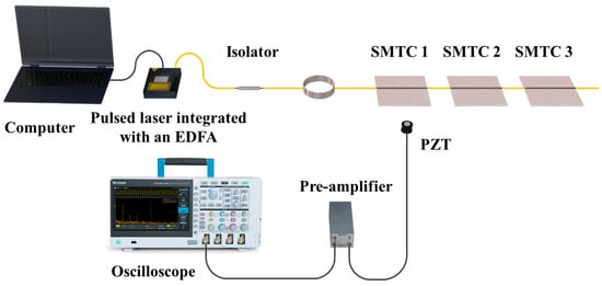 The effectiveness of the proposed system was experimentally verified. As shown in Figure 5, the experimental setup comprises a computer-controlled pulsed laser integrated with an EDFA amplification module (VLSS-1550-M-F-L-MP, CONNET (San Francisco, CA, USA)). The laser emits 5 ns, 3 kHz laser pulses. To safeguard the system, an isolator is employed to prevent any damage caused by the reflected light. The amplified pulsed laser sequentially reached each SMTC-based transducer unit, generating ultrasonic signals due to the thermoelastic effect of the photoacoustic material.