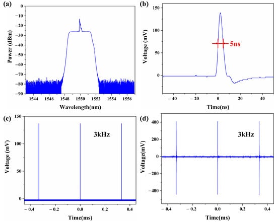 (a) Spectrum of the computer-controlled pulsed laser integrated with an EDFA amplification module measured by a spectrometer. (b) The single laser pulse with a 5 ns pulse width. (c) Pulse sequence with a with a 3 kHz repetition frequency. (d) The ultrasonic signal of the third SMTC structure with a 3 kHz repetition frequency.