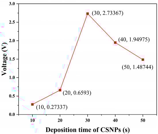 Photoacoustic materials consist of two layers: the light-absorbing layer and the thermal-expanding layer. The light-absorbing layer absorbs the energy of the excitation laser and converts it into heat, which is then transferred to the thermal-expanding layer, causing thermal expansion and ultimately generating ultrasonic signals. The conversion efficiency of photoacoustic effects is directly proportional to the optical absorption coefficient, which in turn is correlated with the concentration of the absorbing material; however, exceeding a certain thickness can reduce solidification efficiency [35,36]. Therefore, it is crucial to investigate the thickness of the absorbing material to optimize transducer performance. Considering the linear relationship between the deposition thickness of CSNP and deposition time [21,37], we fabricated five sets of SMTC structures with a constant coupling ratio of 50%. The amplitude of the generated ultrasonic signal was studied by varying deposition time. Figure 7 shows the results. As the deposition time of CSNPs increased, the amplitude of the ultrasonic signal also increased, reaching 2.73367 V at 30 s. However, further increase in deposition time resulted in a weakening of the ultrasonic signal amplitude due to the negative impact of excessive thickness on the curing process.