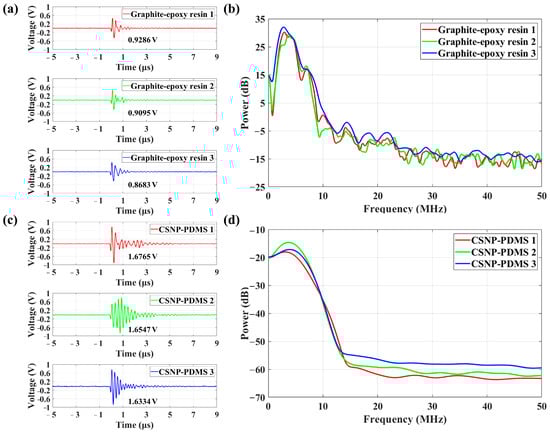 Ultrasonic signals excited by two three-point ultrasonic transducer systems: SMTC-based transducer system with (a) graphite–epoxy resin, (c) candle soot nanoparticle–polydimethylsiloxane (CSNP–PDMS) composite in time-domain, and (b,d) frequency analysis matched with the left.