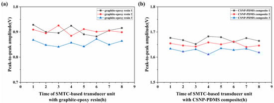 The stability and reliability of the ultrasonic transducer units were evaluated in the same testing environment during an 8-h period, as shown in Figure 9. The obtained results clearly illustrate consistently small peak-to-peak amplitude fluctuations in the ultrasonic signals generated by the three transducer units. In Figure 9a for the SMTC-based transducer units with graphite–epoxy resin, the standard errors were found to be 0.01642, 0.01437, and 0.01103. Similarly, in Figure 9b for the SMTC-based transducer units employing the CSNP–PDMS composite, the standard errors were relatively more stable, measuring 0.005475, 0.004428, and 0.006435. These fluctuations were mainly attributed to variations in the power of the light source. Additionally, the fiber-optic ultrasonic transducer units exhibit high stability and reliability even after operating for long hours, without affecting the detection results.