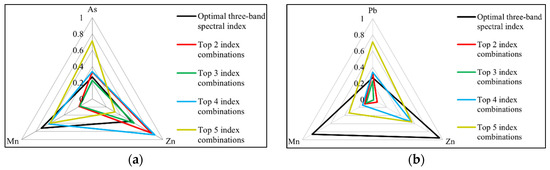 The latter is to optimise the spectral characteristic bands of each element. To reduce the redundancy of spectral features due to the existence of interactions among soil elements, the spectral indices of Pb, As, Zn and Mn extracted from Table 1 were combined according to the ranking of correlation coefficients (taking Pb as an example, the optimal three-band spectral index is the first index in the table; i.e., ① (RFD1278 − RFD622) + (RFD1530 − RFD622). The top two spectral index combinations are ① (RFD1278 − RFD622) + (RFD1530 − RFD622) and ② (RFD466 − RFD622) + (RFD1530 − RFD622). The top three spectral indices were combined as ① (RFD1278 − RFD622) + (RFD1530 – RFD622), ② (RFD466 − RFD622) + (RFD1530 − RFD622) and ③ (RFD450 − RFD622) + (RFD1530 − RFD622). The top four spectral index combinations are ① ② ③ ④ and the top five spectral index combinations are ① ② ③ ④ ⑤). With combinations of the same number of spectral indices, Pb, As, Zn and Mn were taken in turn as the target element, and the Pearson coefficients between the characteristic bands of the target elements and those of the other three elements were calculated and analysed. Based on the results, separate radar plots of the correlation coefficients between Pb, As, Zn and Mn were obtained (Figure 5). Figure 5 shows that the top three spectral index combinations were suitable for selection to ensure a small correlation between the characteristic bands of Pb and those of each other element; arsenic is the same case. The smallest correlation between the characteristic bands of Zn and those of each other element indicates the top two spectral index combinations and the same is true for Mn.