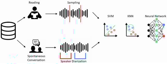 Importantly, vocal analysis often integrates machine learning (ML) techniques with the aim to improve the classification performance between healthy and pathological voices []. The effectiveness of ML techniques combined with vocal analysis has been explored for the classification of health conditions in several pathologies, such as Parkinson’s disease (PD) [].