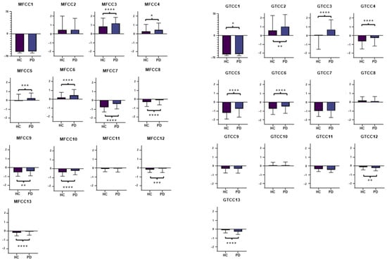 Furthermore, a t-test was performed for both MFCCs and GTCCs extracted from the diarized recording to examine the differences between PD and HC. This analysis aims at gaining a more comprehensive understanding of how differences in the cepstral coefficients are associated with the health status of the individual.
