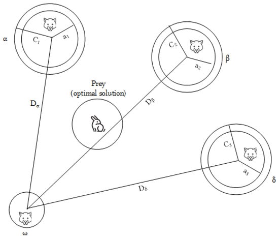 (Location update of a wolf). The position of each grey wolf is updated as searching for prey, as shown in Equation (5):
