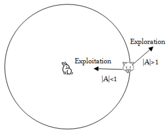 MOGWO has two phases of exploration and exploitation. Grey wolves would be scattered throughout the space and search for prey as , which is called the exploration phase. Otherwise, as , grey wolves would concentrate the prey in a certain area, which is called exploitation phase as shown in Figure 2.