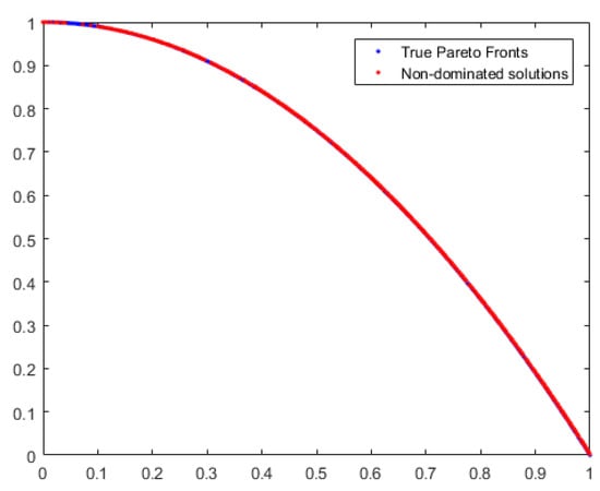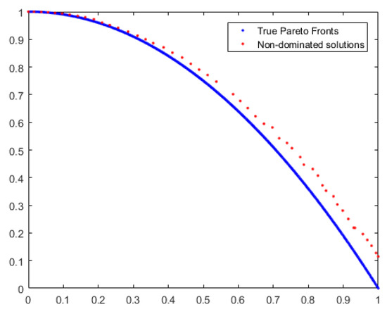 (Pareto optimal solution). Given a feasible point x, if not exists , then x is the Pareto optimal solution of the specific MOP. That is, in the feasible domain space, there is no particle that can dominate the particle x, and we can also call it a non-dominated solution. Meanwhile, the Pareto Front is constructed from a set of all Pareto optimal solutions.